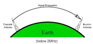 v  Ground wave propagation follows the curvature of the Earth. Ground waves have carrier frequencies up to 2 MHz.