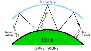 v  Ionosphere propagation bounces off of the Earth’s ionosphere layer in the upper atmosphere. It is sometimes called double hop propagation. It operates in the frequency range of 30 – 85 MHz. Because it depends on the Earth’s ionosphere, it changes with the weather and time of day. The signal bounces off of the ionosphere and back to earth.