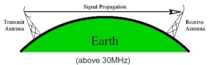 v  Line of sight propagation transmits exactly in the line of sight. The receive station must be in the view of the transmit station. It is sometimes called space waves or troposphere propagation. It is limited by the curvature of the Earth for ground-based stations (100 km, from horizon to horizon). Reflected waves can cause problems. Examples of line of sight propagation are: FM radio, microwave and satellite.