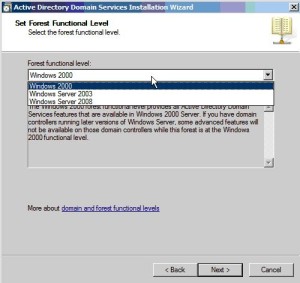Pick the right forest function level. Windows 2000 mode is the default, and it allows the addition of Windows 2000, Windows Server 2003 and Windows Server 2008 Domain Controllers to the forest you’re creating.