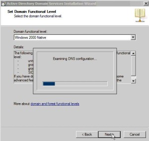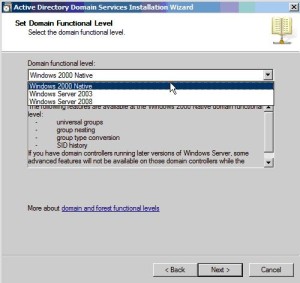 Pick the right domain function level. Windows 2000 Native mode is the default, and it allows the addition of Windows 2000, Windows Server 2003 and Windows Server 2008 Domain Controllers to the domain you’re creating.