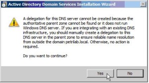 You’ll probably get a warning about DNS delegation. Since no DNS has been configured yet, you can ignore the message and click yes.