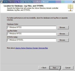 Next, change the paths for the AD database, log files and SYSVOL folder. For large deployments, carefully plan your DC configuration to get the maximum performance. When satisfied, click next.