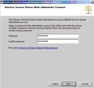 Enter the password for the Active Directory Recovery Mode. This password must be kept confidential, Click Next.