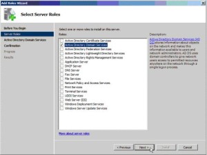 In the Select Server Roles window, click to select Active Directory Domain Servicesand then click next.