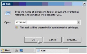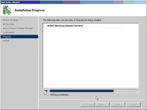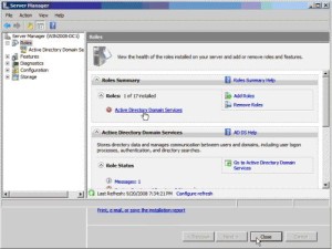 Going back to Server Manager, click on the Active Directory Domain Services link, and note that there’s no information linked to it, because the DCPROMO command has not been run yet.